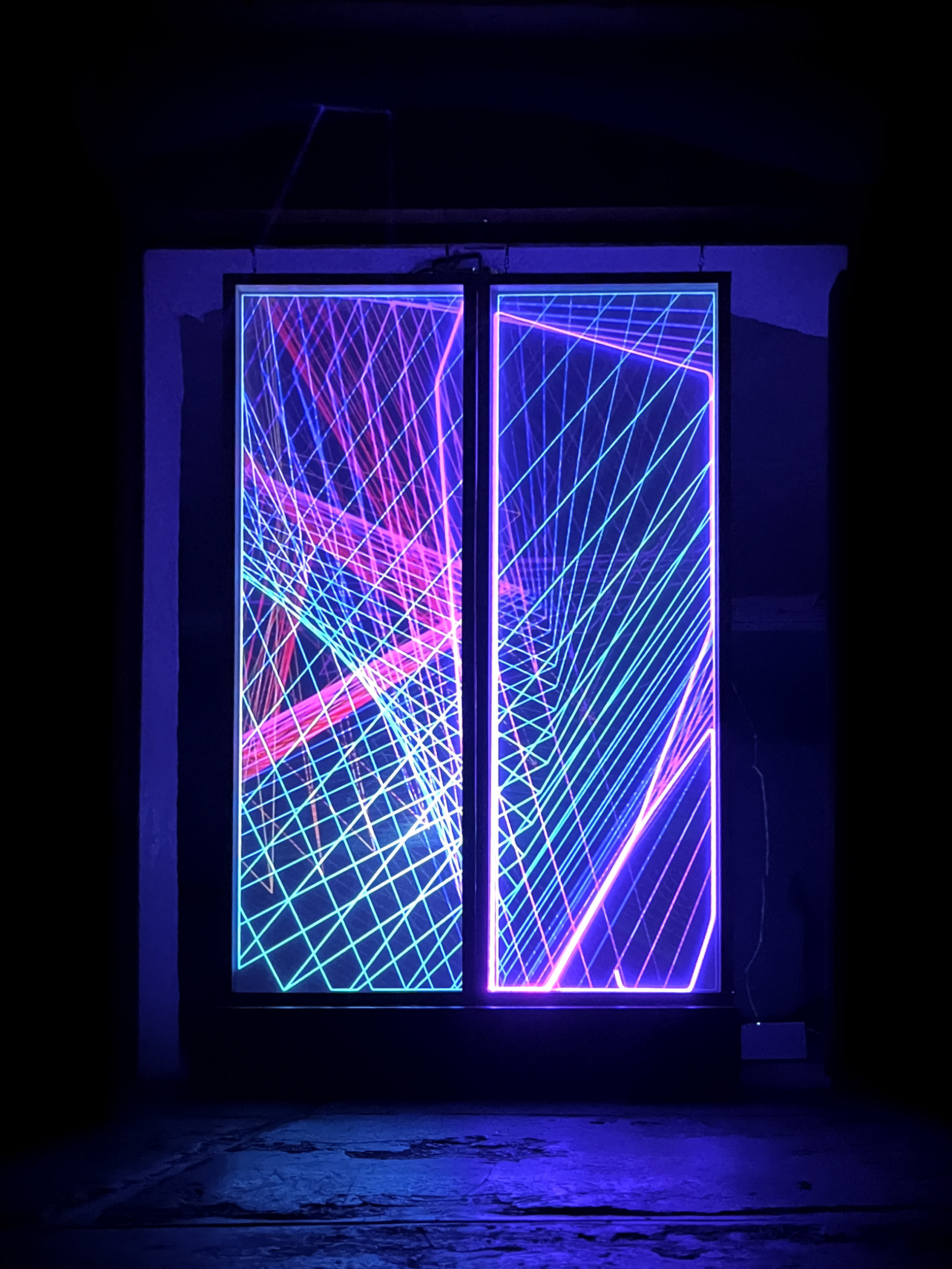 The laser line changes color and sweeps the surfaces following the rhythm of the music while the projector prints the trace left by the passage of this line.