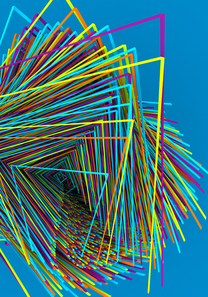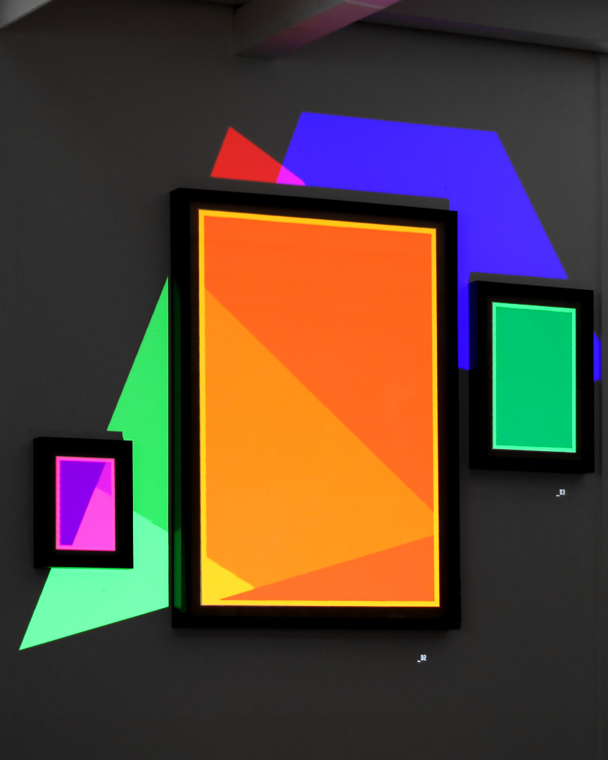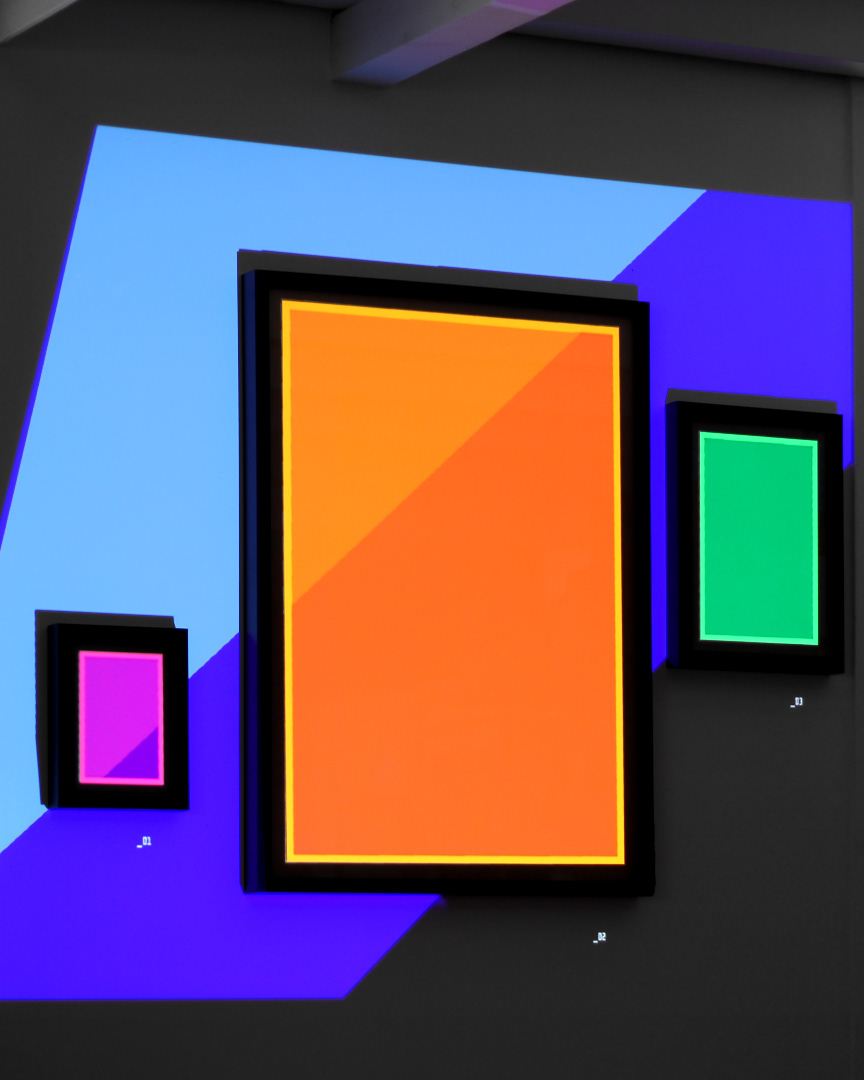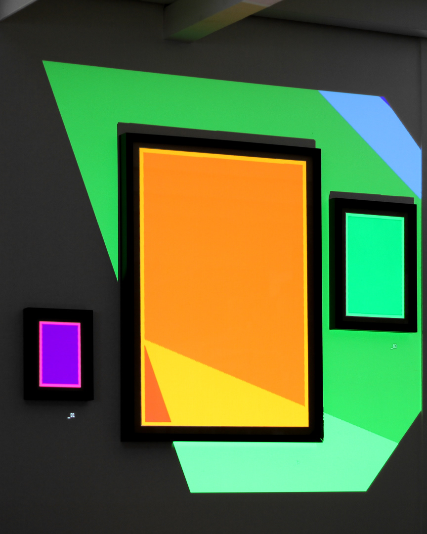 Procedural 3D generative geometry projection on wall and color papers in frames.
