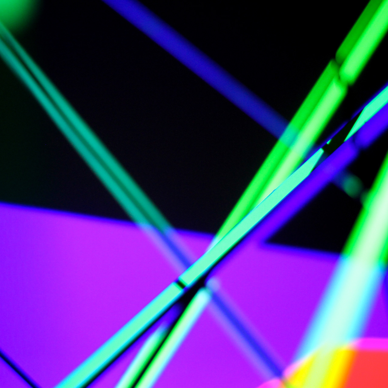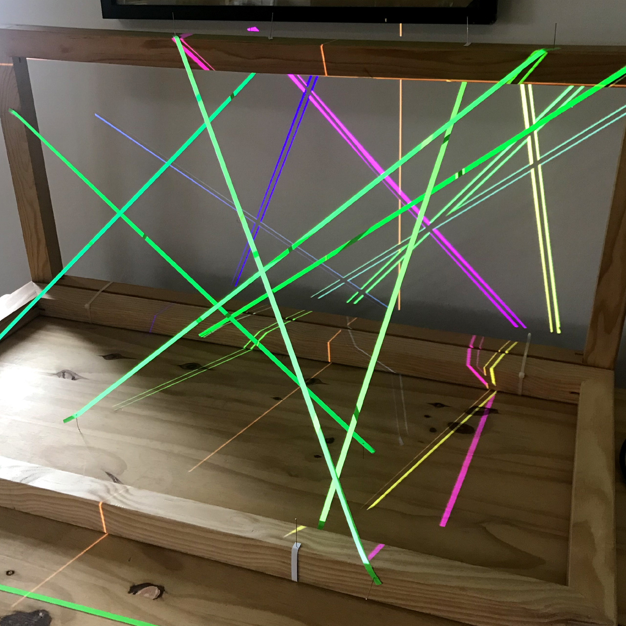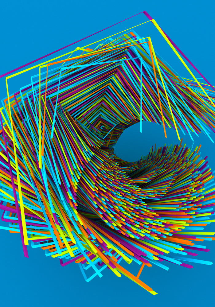 Procedural 3D generative geometry projection on wall and color papers in frames.