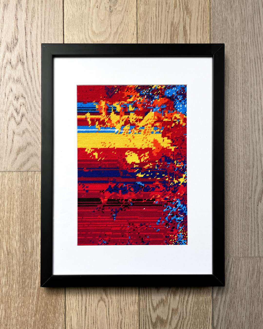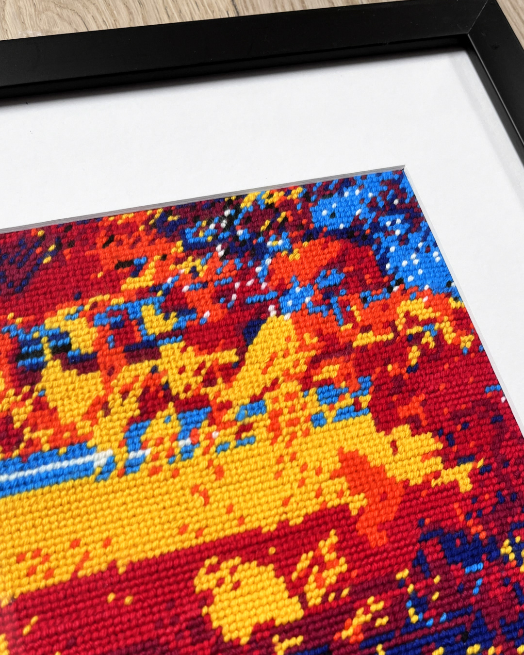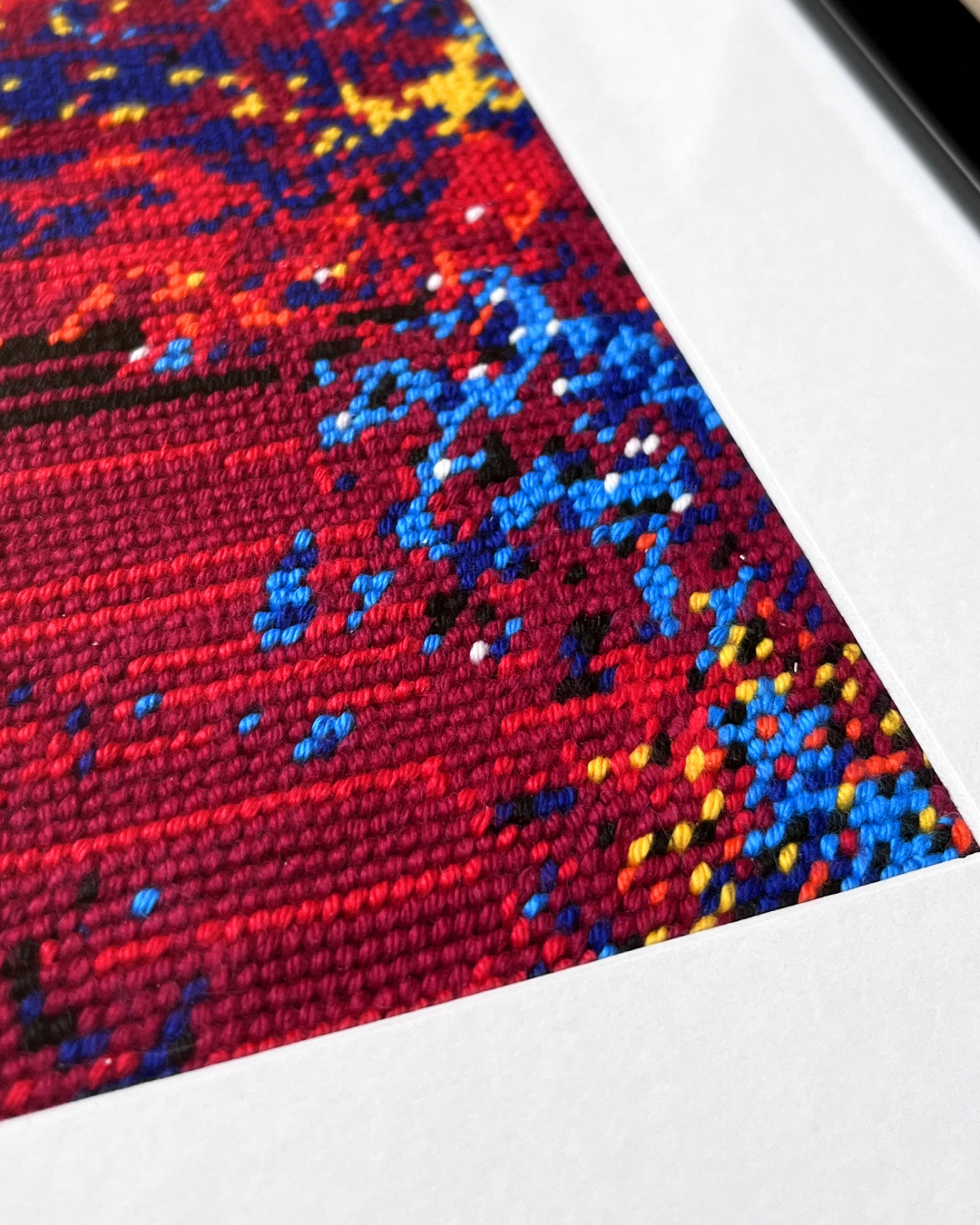 Hand-embroidered from a pattern printed on blank canvas.