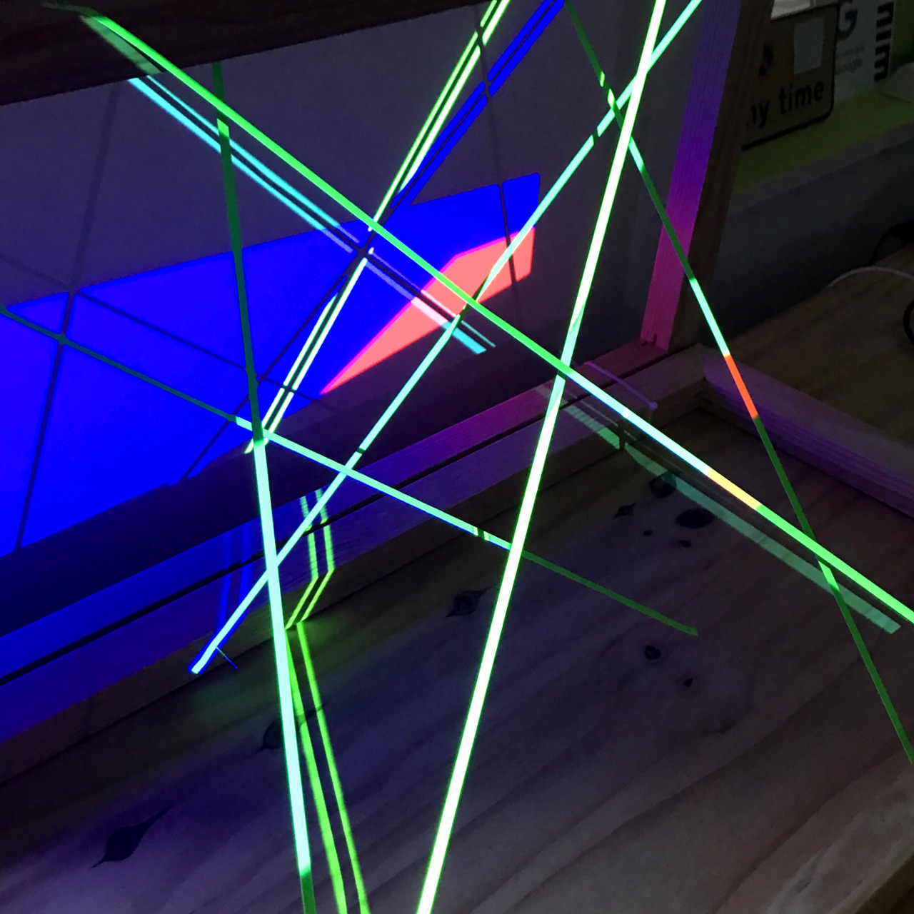 Audio generative geometry projection on wall and green color paper in frame.